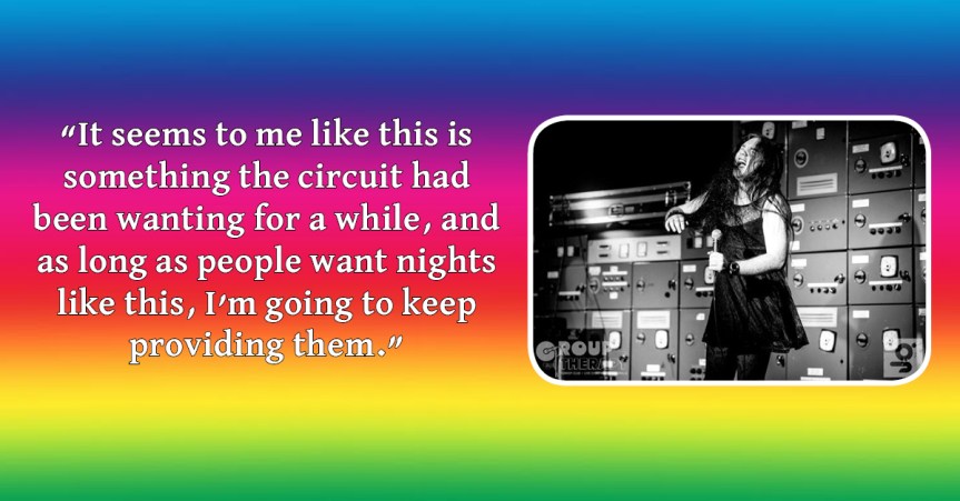 I’m trialling a content warning system where potential triggers in the show are declared beforehand. So far I don’t think anyone has made use of it, but I’d rather have it and not use it than need it and not have it. It’s in the early stages, so I’m sure it’ll evolve and hopefully work better in future, but as far as I know no other clubs have implemented this. I’d love to get it working and become more of a standard, at least for safe space clubs, if not the wider circuit.