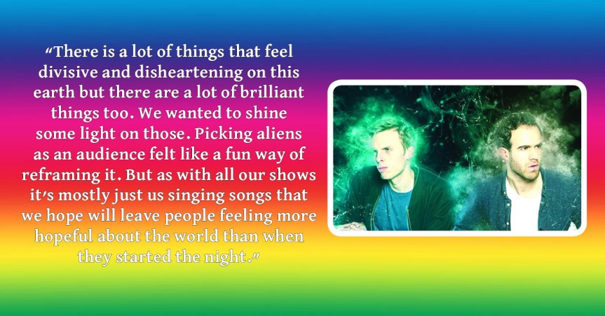 We wanted to try and shine some light on those. Picking aliens as an audience felt like a fun way of reframing it. But as with all our shows it’s mostly just us singing songs that we hope will leave people feeling more hopeful about the world than when they started the night.