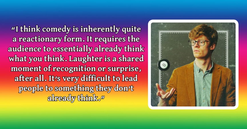 I’m not massively optimistic about this. I think comedy is inherently quite a reactionary form. It requires the audience to essentially already think what you think. Laughter is a shared moment of recognition or surprise, after all. It’s very difficult to lead people to something they don’t already think.