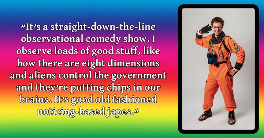 Because it’s real and the funniest things are funny because they’re true. So in that sense it’s a straight-down-the-line observational comedy show. If you like Mikael Makintosh and Michael Finnegan then this show should resonate with your frequency level. I observe loads of good stuff, like how there are eight dimensions and aliens control the government and they’re putting chips in our brains. It’s good old fashioned noticing-based japes.