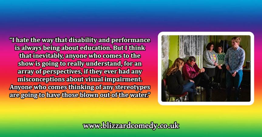 I was really surprised. Some of the humour is quite dark and satirical. Not that this is an educational thing – I hate the way that disability and performance is always being about education. But I think that inevitably, anyone who comes to the show is going to really understand, for an array of perspectives, if they ever had any misconceptions about visual impairment. If they believe that it was a really diverse experience, that’s going to be confirmed. But anyone who comes thinking of any stereotypes are going to have those blown out of the water.