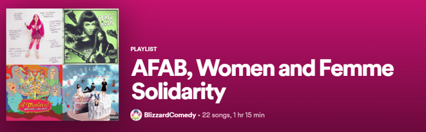So this playlist is a collection of Riot Grrl, hip-hop and folk from AFABs, Women & Femmes from around the world, from different cultures, different upbringings, different assigned genders, but all sharing their experiences with womanhood, both on an internal level and the external treatment it entails.