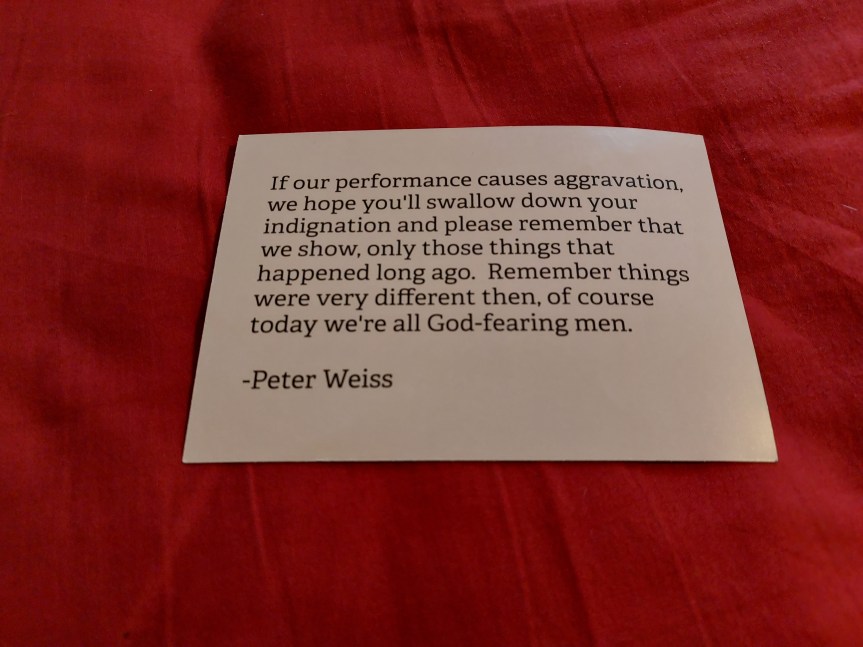 The actors are already in position as you take your seat. Two people with burlap bags over their faces stand still and stiff in uncomfortable positions, while three masked figures watch over them, dancing. There is an immediately ominous atmosphere. If you hadn’t read the description of the play before you booked your ticket, you nonetheless get a very clear impression of what awaits before the show even begins.
